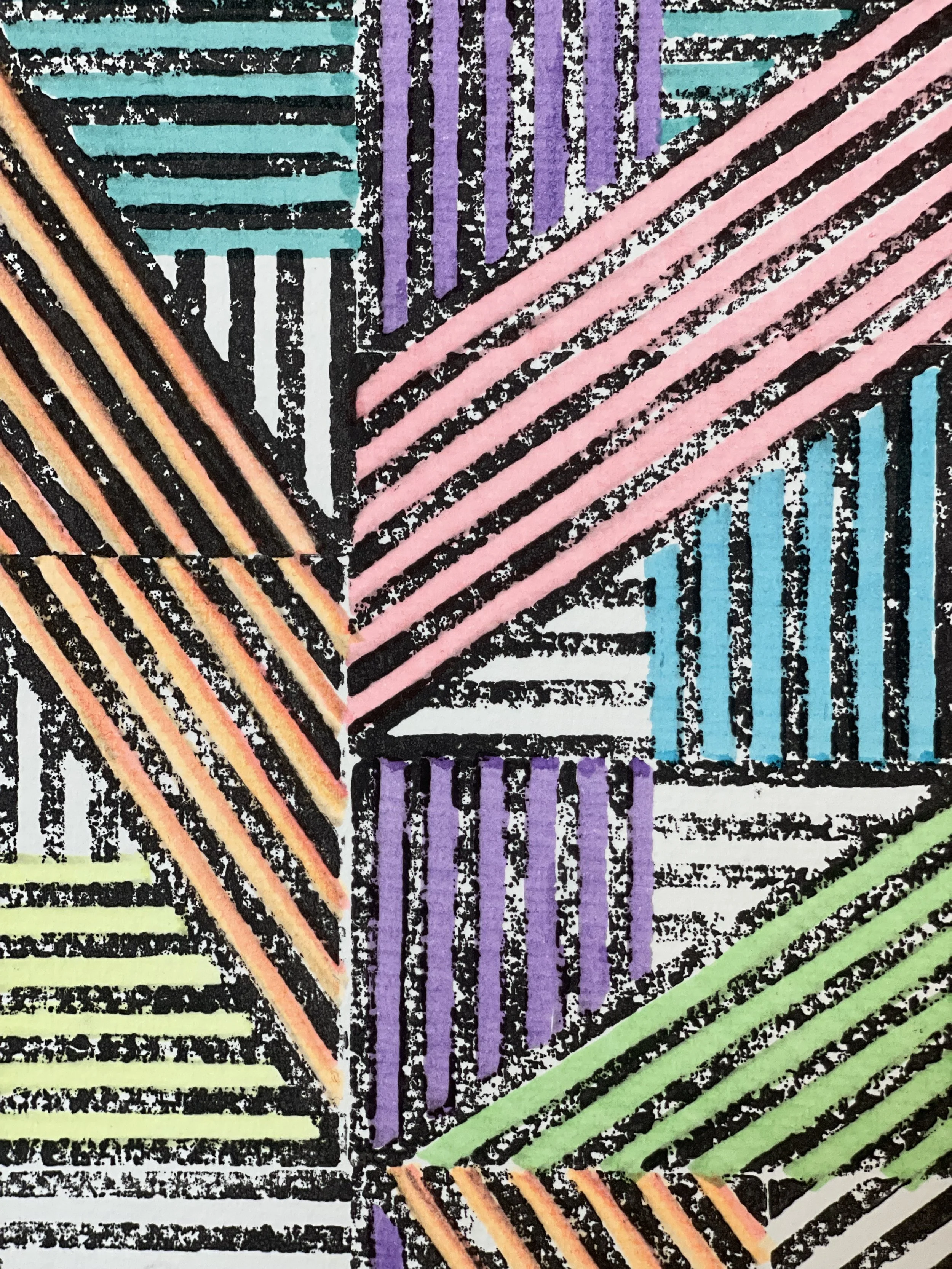 In Marie’s piece, the essence of the mountains is captured through warm tones, shape, and form. The calm serenity of the forest draped in sunshine builds a mountainous landscape. To harness this meditation on nature, I used natural elements — plants (coffee beans) and minerals (graphite) — to also build an organic, contemplative scene. The smell of burnt coffee, rough texture of the painted scene, and smooth and shiny wavy line invite the senses to pause and reflect, and to just be.